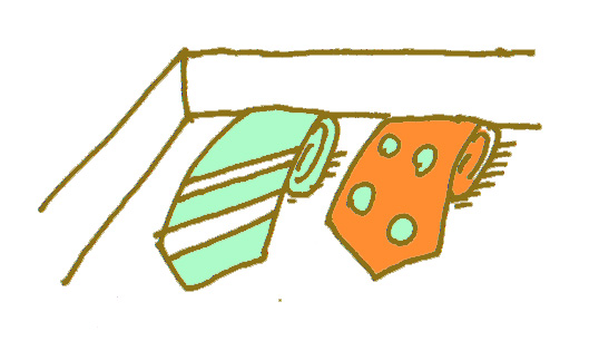 織物のネクタイは、軽くスチームアイロンをかけ、ハンガーなどに吊るします。締めシワを取り除くには小剣のほうから巻いて保管するのも効果的です。汚れた場合は、直ぐに水に濡らしたハンカチなどで軽く叩いて汚れを取り除きます。表面を擦ることは生地を傷めます。絹織物の剣先が毛羽立ってきた場合は、ライターの火でかるくあぶると綺麗になります。その場合、強く当てすぎないように注意することが必要です。 |